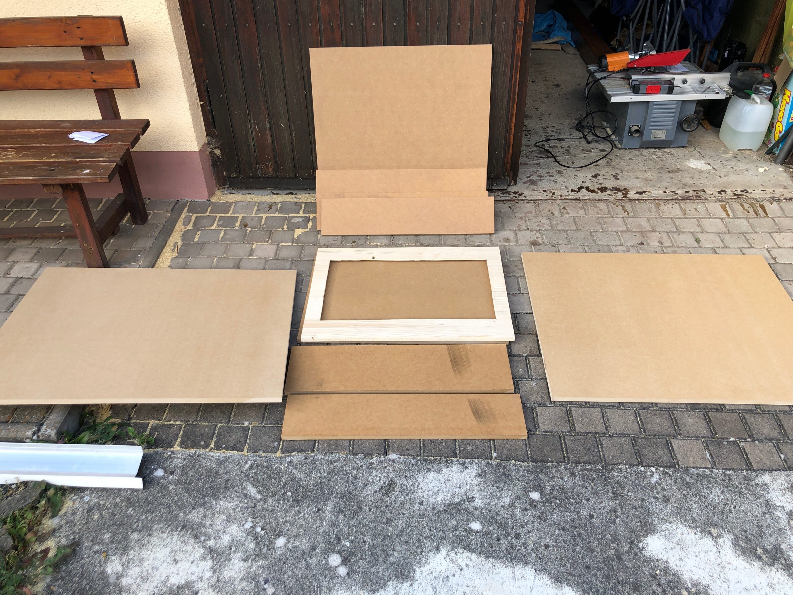 We went with standard 2cm MDF sheets and my father cut them to size with the measurements derived from the monitor bezel centerpiece.