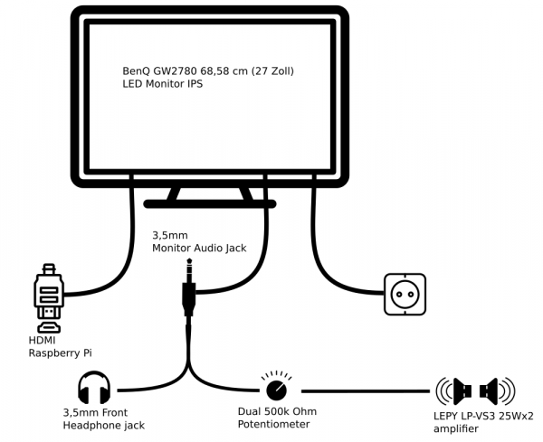 The sound was a bit more complicated. I wanted a volume control knob on the outside but also did not want to disassemble any audio amplifier.